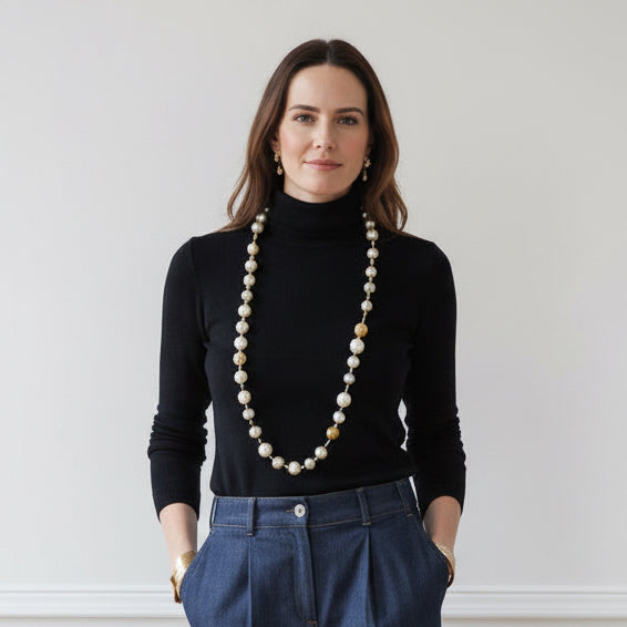 The COSMIC Necklace is a long statement piece from the COSMIC Collection, designed to embody celestial elegance. Made with a luxurious black ribbon, it features oversized white pearls and bold gold-toned spheres, an unexpected fusion of softness and strength.