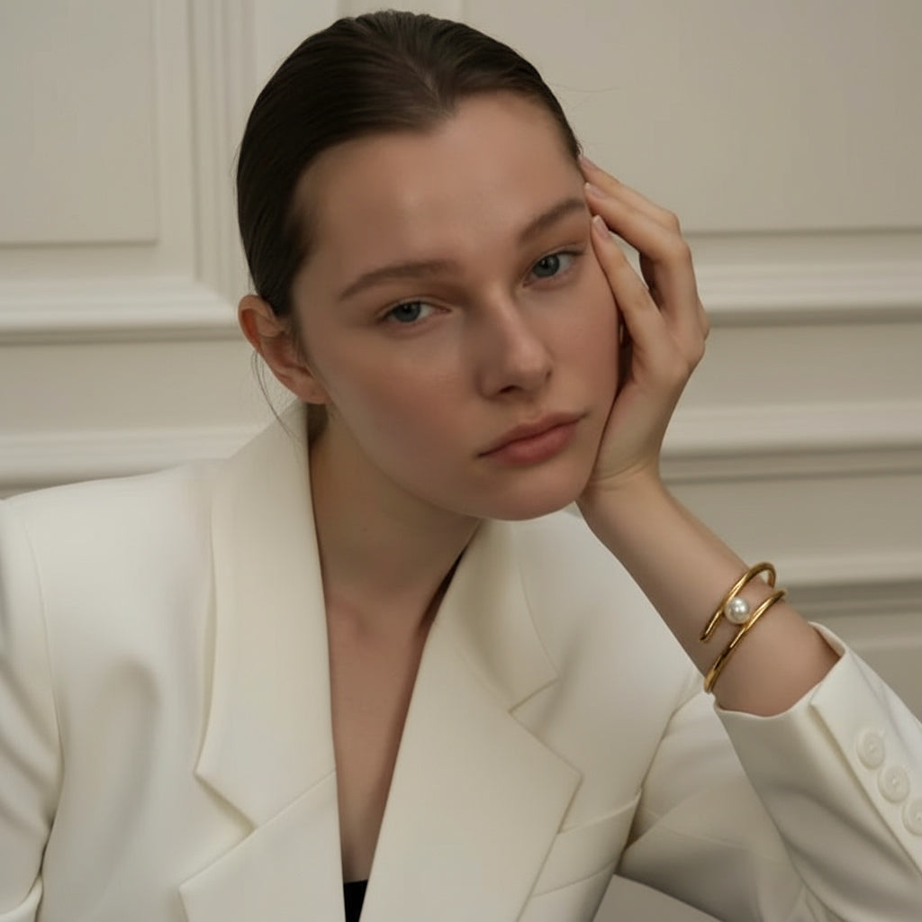 The Luna Bracelet is an ode to quiet luminosity — a perfect harmony between strength and softness. Its open, minimalist design embraces a luminous pearl at its center, evoking the moon suspended in golden light.