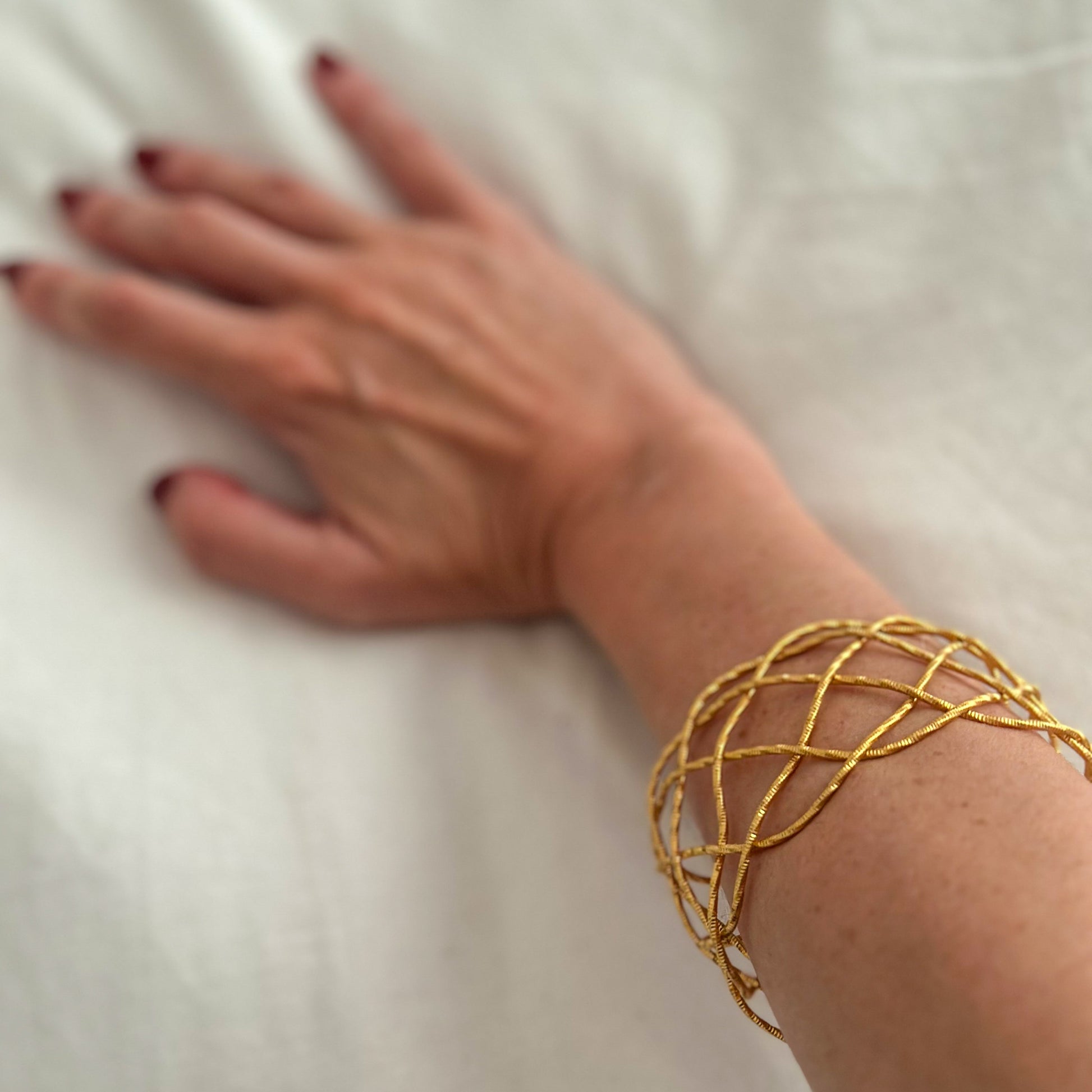 The Timeless Cuff embodies bold simplicity and sculptural elegance. Crafted in stainless steel and plated with PVD real gold, its open lattice design plays with light and shadow, creating a modern yet enduring statement piece. Lightweight yet striking, it’s perfect for layering or wearing alone as a centerpiece of your style.